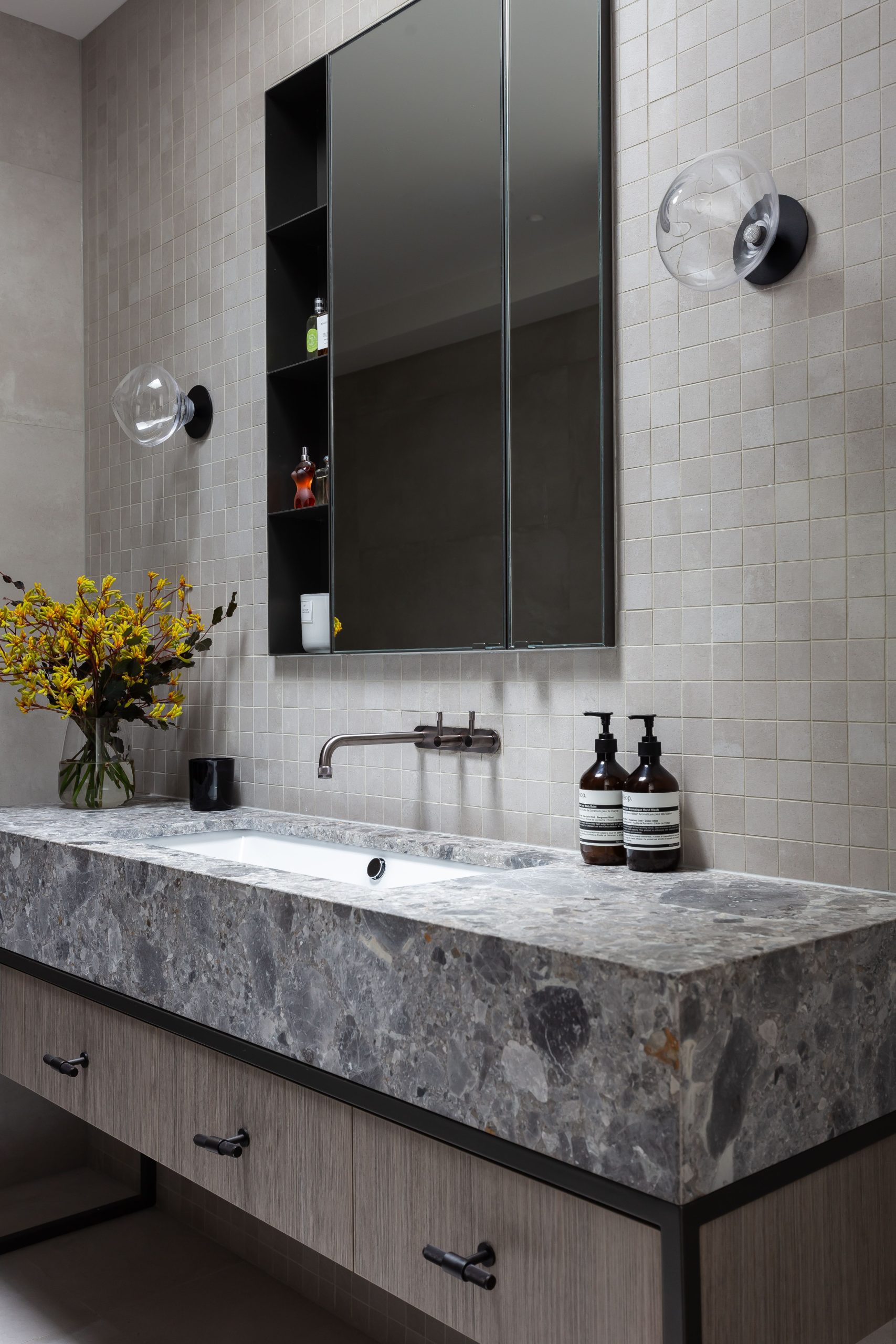 Torrone, Ceppo Di Gris, is a very unique stone, only describable as nature’s terrazzo. A dolomitic monogenic breccia with a conglomerate appearance making an artwork fit for any space. These natural stone slabs are suitable for both internal and external applications as well as kitchen benchtops and vanities. These Ceppo Di Gris slabs are available to view in our Sydney showroom.